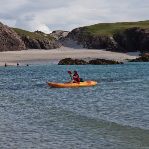 The afternoon was spent on one of the most picturesque beaches I’ve seen, Ceannabeinne beach; green sea, high waves, beautiful sand and overlooked by the magnificent Highlands. The Musician was a bit reluctant when we first arrived to get back in amongst the waves due to the washing cycle she’d been put through a couple of days ago. A few minutes later and she was joining Bob with buoyancy aid surfing, apparently if you threw yourself into the crashing wave it would carry you forward.