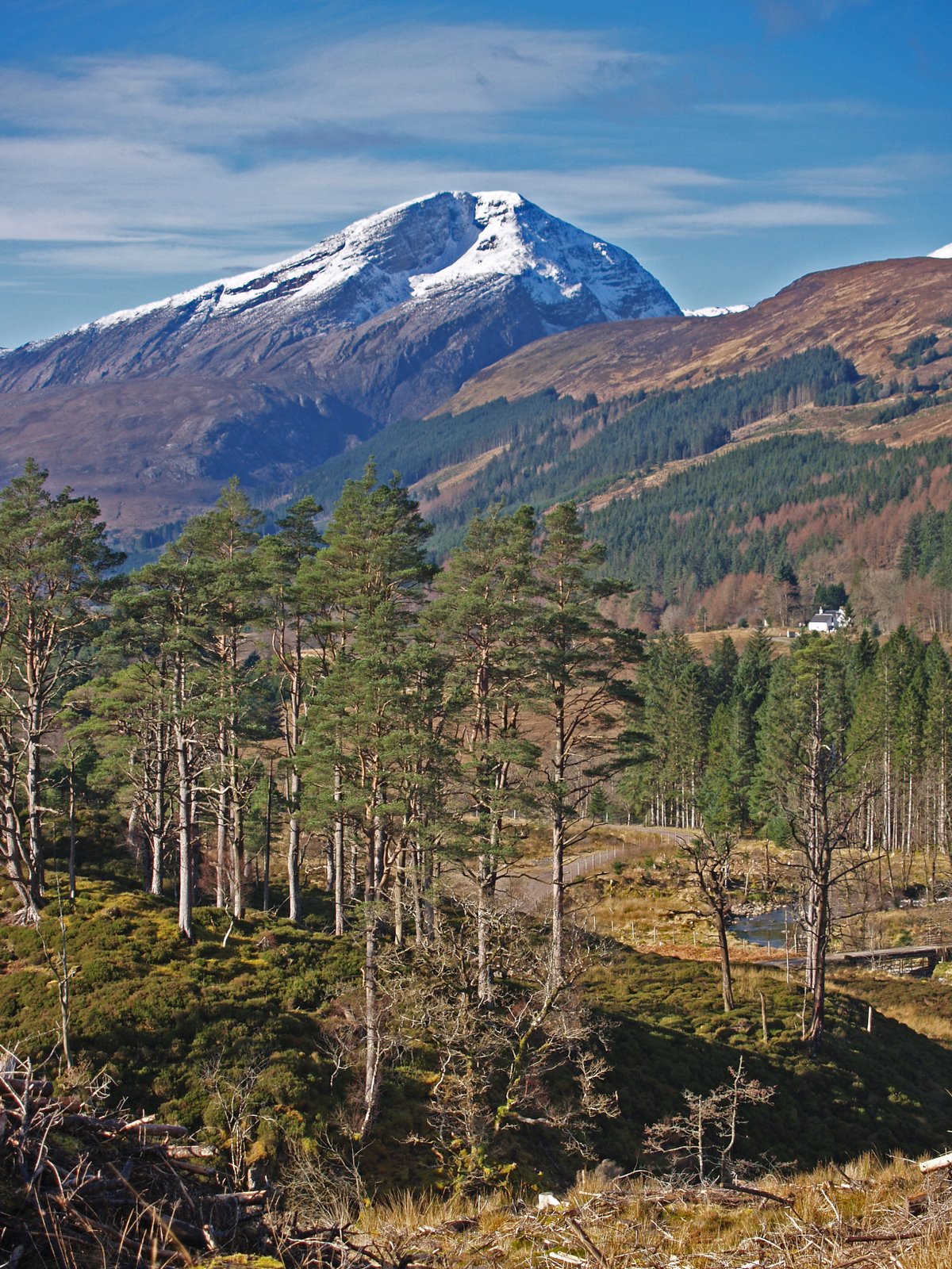 This morning Ben Wyvis was white. I took the train from Beauly to Achnashellach where it was raining on the track. After the two carriage train had rumbled round the corner between the rhodedendrons I set off along the sleepers for a couple of hundred metres before climbing a fence and striking onto the hillside.